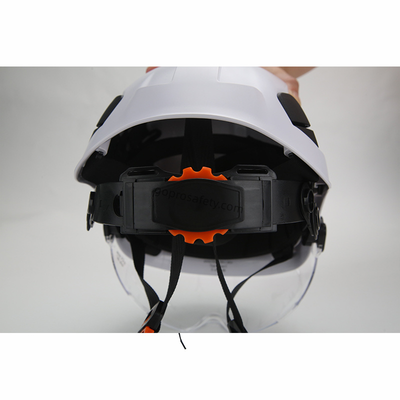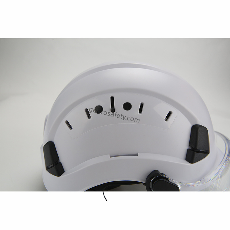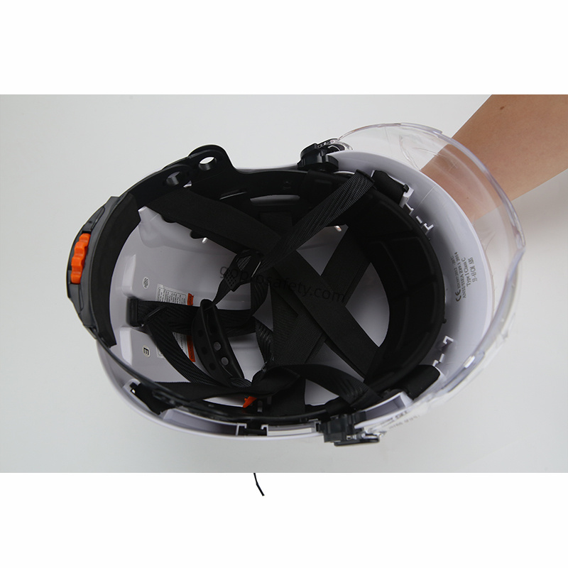 The Climbing Helmet with Integrated Eyewear is engineered to protect workers performing tasks at height or in industrial environments where head and eye protection are equally important. The helmet features a durable ABS outer shell for impact resistance and an integrated ocular covering that protects both eyes from dust, debris, and mechanical hazards.